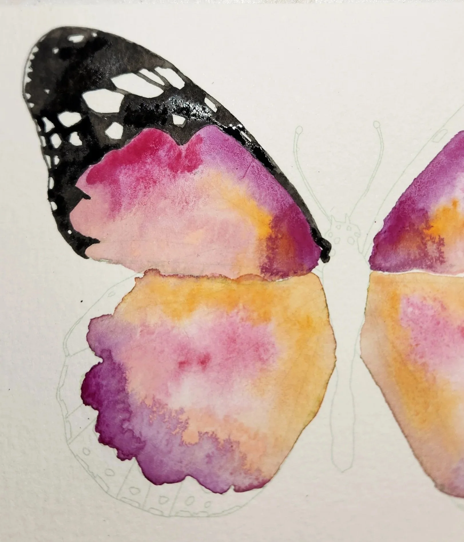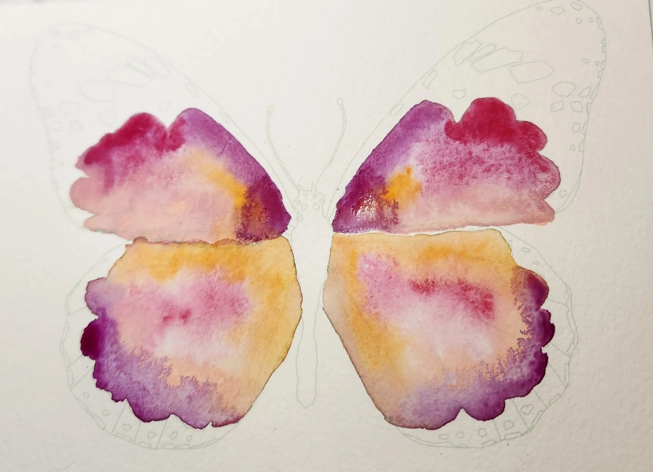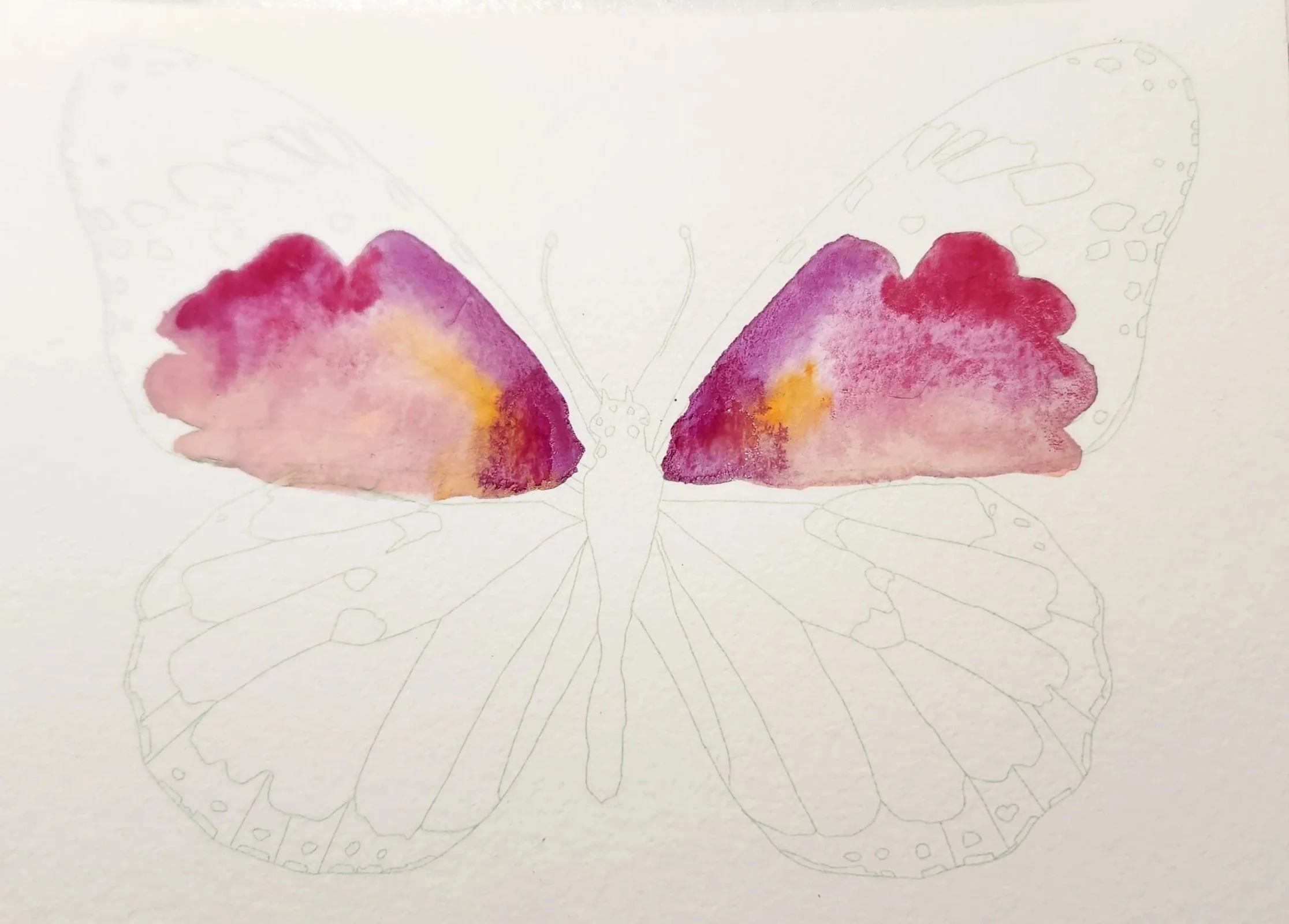 2. Next paint the lower wings in the same process. Lay down clean water on the bottom wings and add orange Windsor along the top, purple lake along the bottom of the wings, and some shell pink and carmine in the center. Allow to dry. The exact pattern on the wings doesn’t matter, just have fun with it!